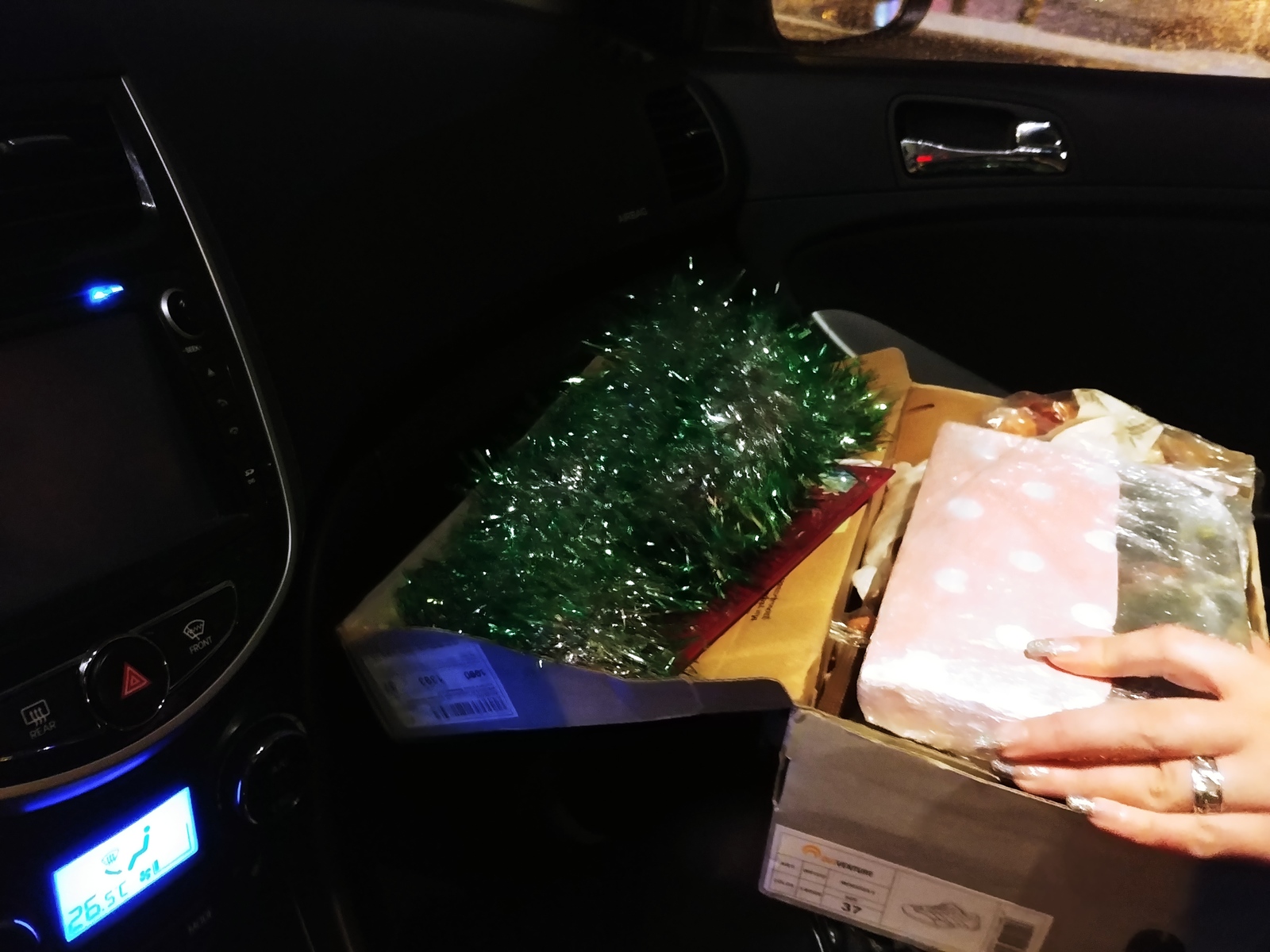 Следующий этап распаковки начался по дороге с работы. Нужно было чуток покатать подругу по городу, поэтому пока я рулила по сопливой слякоти она коварно потрошила подарок дальше. Пришлось во имя отчета одним глазом смотреть на дорогу, вторым в камеру и лихорадочно фоткать)