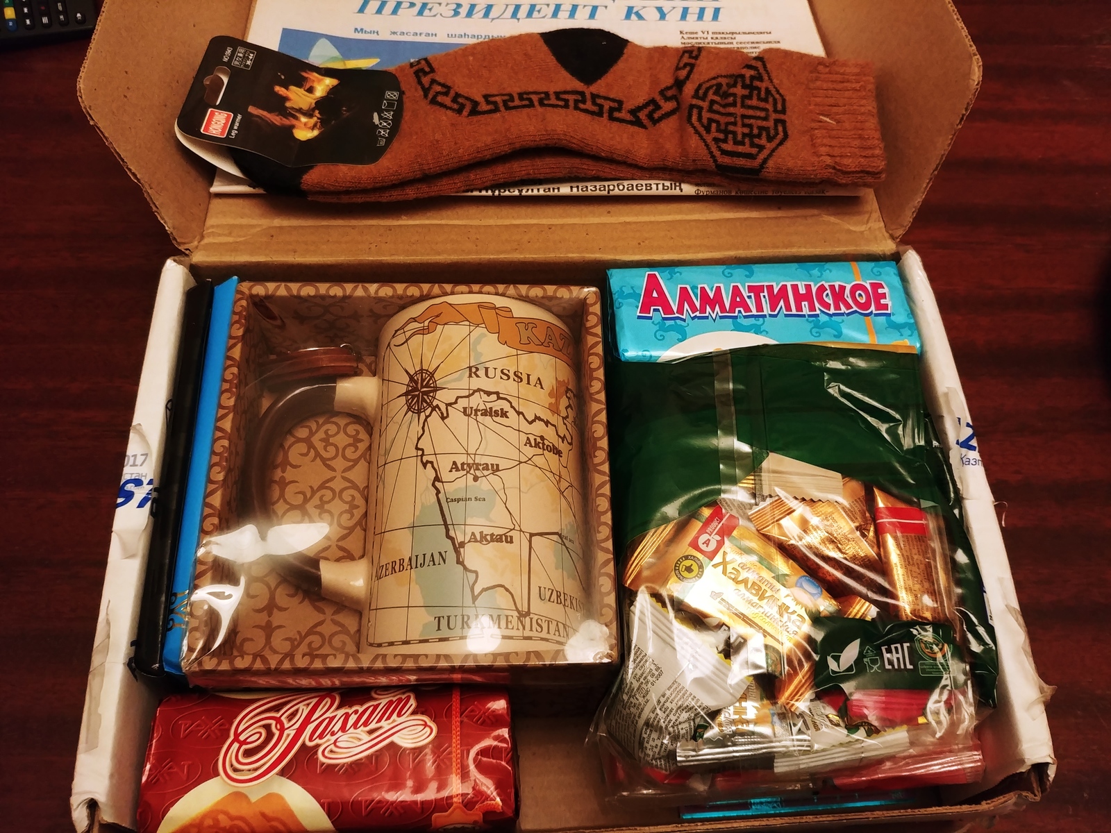 Откладываю солнцеликого в сторону и вижу под ним теплые носки с национальным узором, вкусно-сладкое и гигантскую глиняную кружку с картой Казахстана: