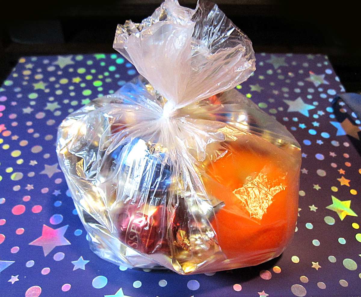 в детстве, помню, нам везде вручали "сладкий подарок": простой полиэтиленовый кулёк, в нём 1 мандаринка, 80% карамелек (чаще всего некондиционных), 10% конфет типа "начинка в шоколаде" и 10% (1-2 конфетки) реально шоколадные. в школе и в ДК на всех ёлках такое было. конечно же, первыми съедались шоколадные конфеты и мандаринка, затем шоколадно-начинчатые, а карамельки обычно компенсировали разочарование в течение долгого времени либо лежали в вазочке \ в карманах до морковкина заговения.