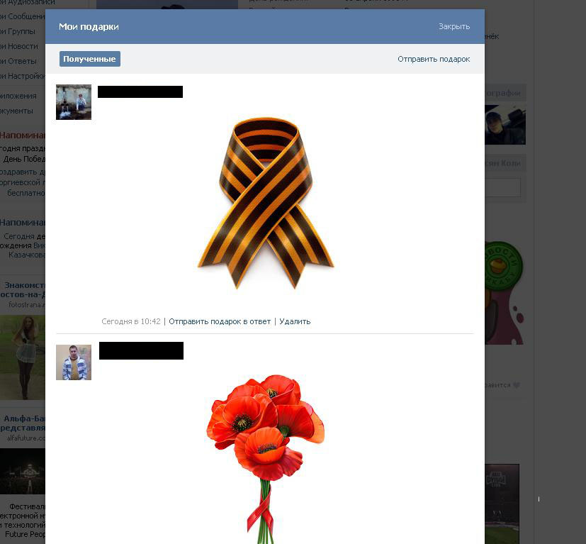 Нам дали возможность раздать подарочки в виде георгиевских ленточек. И честно сказать я не вижу смысла раздавать их друзьям...ну реально,какой смысл раздавать их людям которые и так все понимают,помнят и чтят.