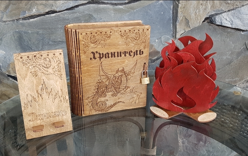 Ну и фишка - огонь органайзер для ручек и карандашей. Все отрисовывала и расчитывала сама (конструктив). Гравировку частично сама рисовала с картинки, частично переводила в спец програмке, потом доводила до ума.