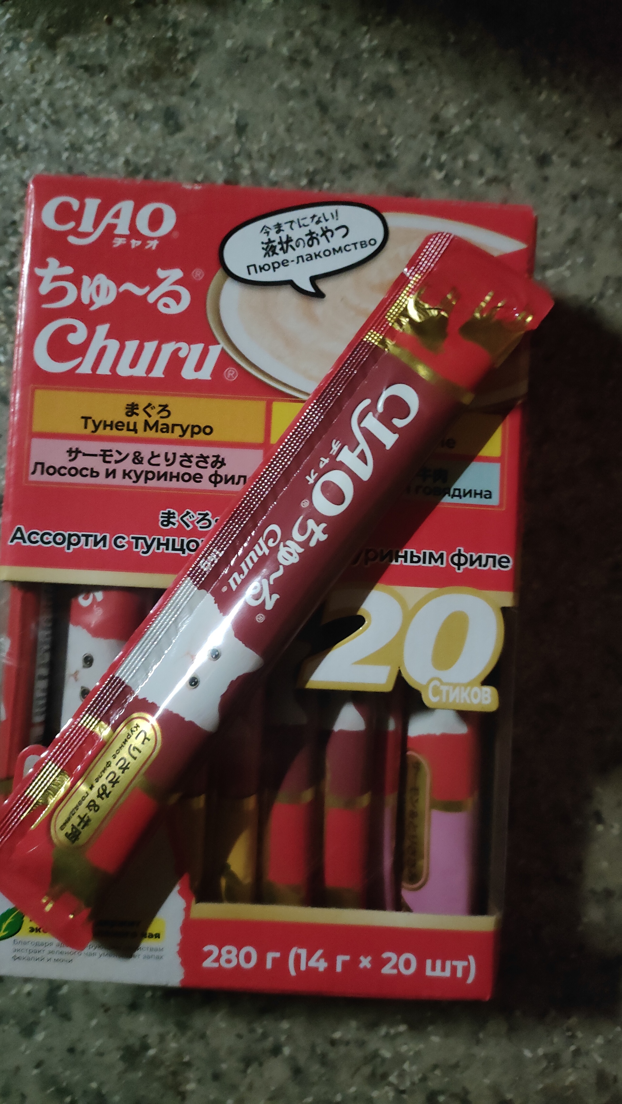 Набор кормов в маленьких упаковках. Вся их линейка. В виде пюре. Порция коше ровно на один раз. Ей очень понравилось! С новым годом, Коша!