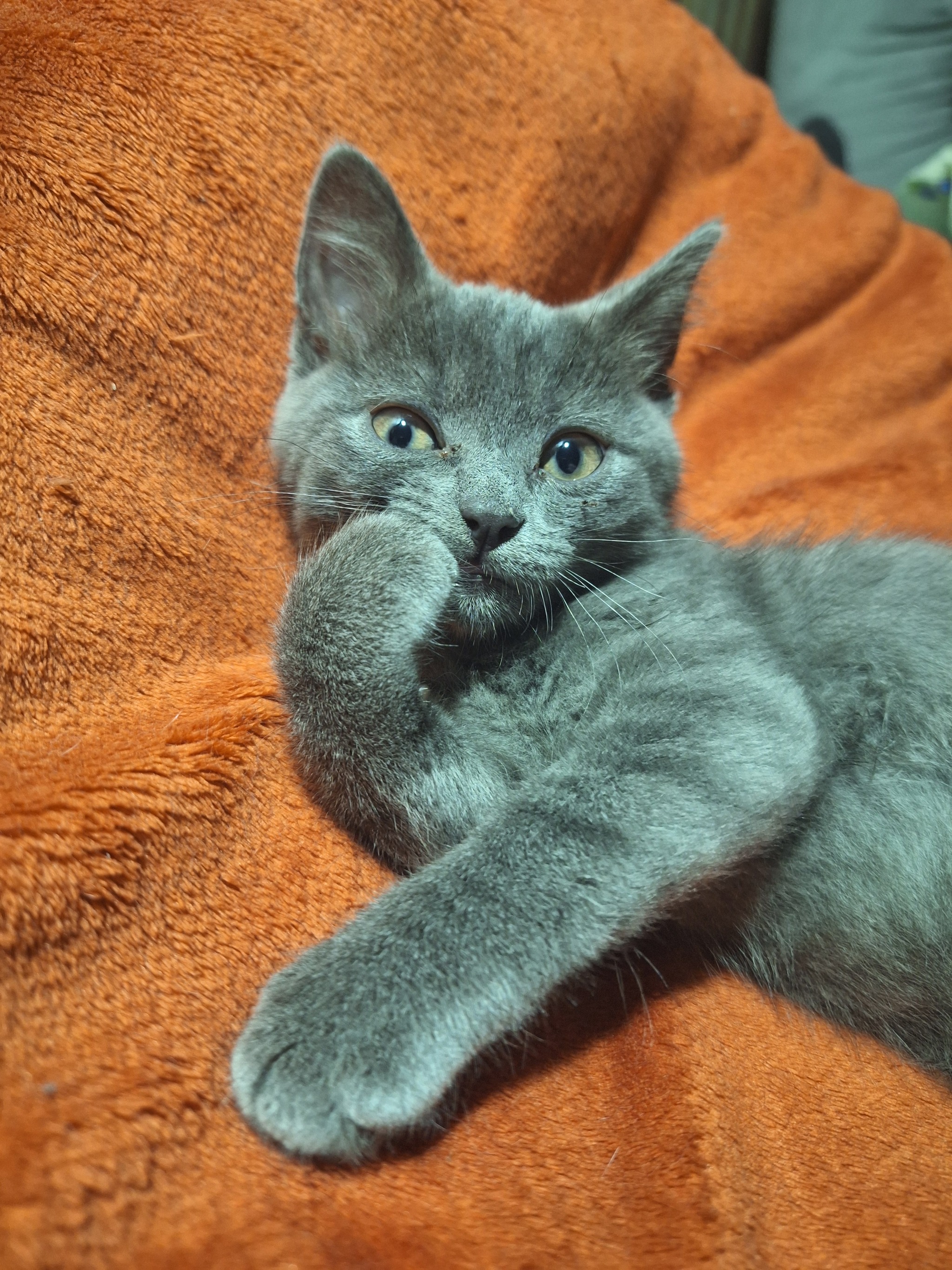 Старшая кошка ругается на нового жильца, поэтому пока грустный. Надеюсь, скоро подружатся. 😊