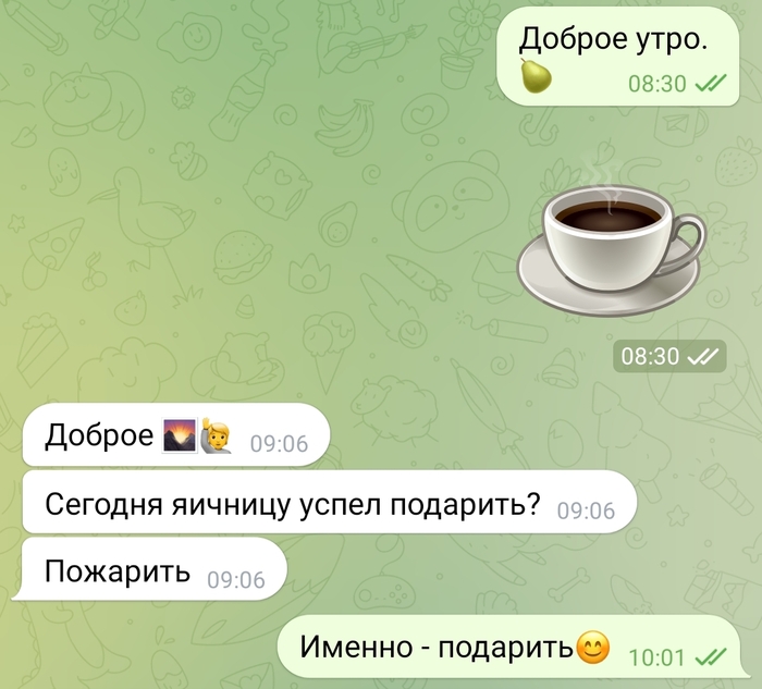 GoffT25 2 года назад Подарок С утра встаю раньше жены, ухожу на работу - она ещё спит. Мой завтрак и её - мои проблемы (нет). Вчера... [моё] Подарки Юмор Жена Завтрак Еда Ещё 0