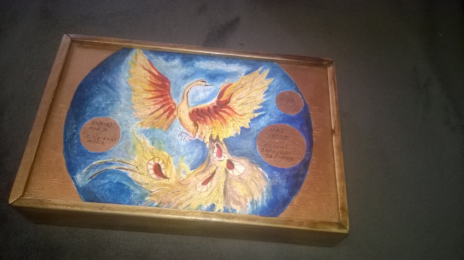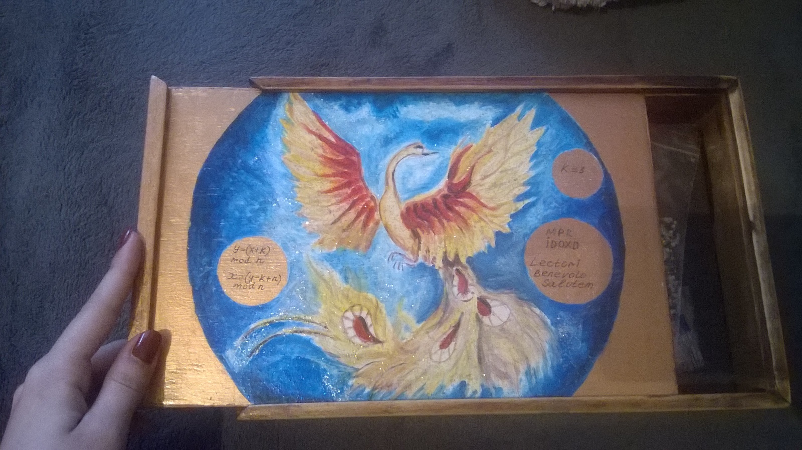 Шкатулку сделал папа, малышка нарисовала жар-птицу. Шкатулка необычная, это шкатулка с секретом или шкатулка-загадка. Подсказки написаны на лицевой части. Секрет раскрывать сразу не буду, может кому-то будет интересно поломать мозги (сразу говорю, загадку придумал папа, 8-ми летнему ребенку это не по силам)