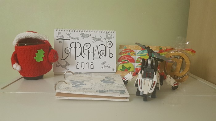 Дальше я достал кружку с милым вязаным чехольчиком. Свечка с символом нового года собакой. Очаровательный Тяфдендарь, я пока его не листал, буду каждый месяц на работе открывать и любоваться смешными братьями нашими меньшими. Очень красивая тетрадка деревянным переплётом на кольцах и сделанной под старину коричневой бумагой. Выглядит здорово конечно, но я навряд ли решусь осквернить её своим кривым почерком и обычной шариковой ручкой! Ну и в заключении конечно поздравительная открытка с теплыми словами и пакетик сладостей.