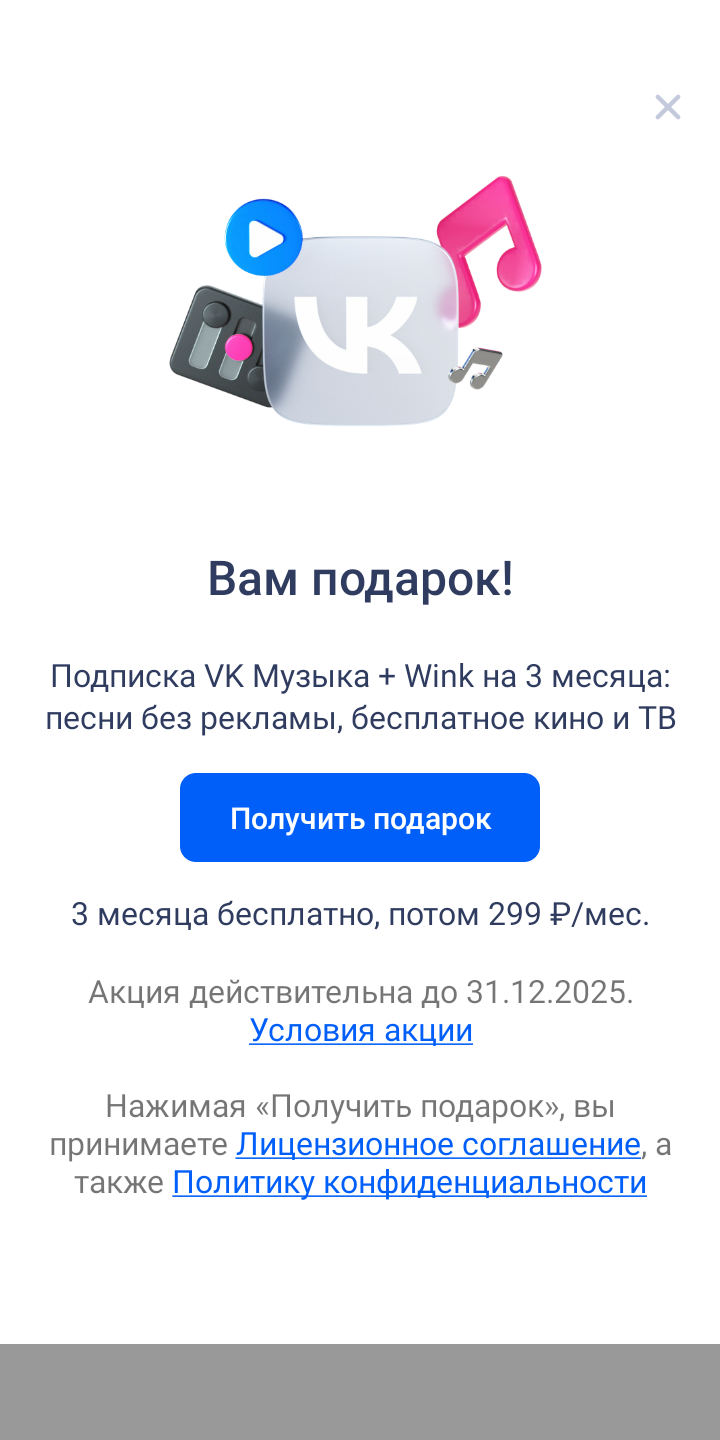 6 Kachanoff Подарок от ВК 11 месяцев назад Купил на кухню капсулу ВК, смотрю, там подарок: подписка на ВК музыку на три месяца. Ну, думаю, хорошо, чо. Открываю: Вижу условия: три месяца бесплатно, потом 299/мес. Условия на данный момент: Прикольный подарок, так-то... [моё] Бесплатно Делюсь радостью Длиннопост Ещё 0