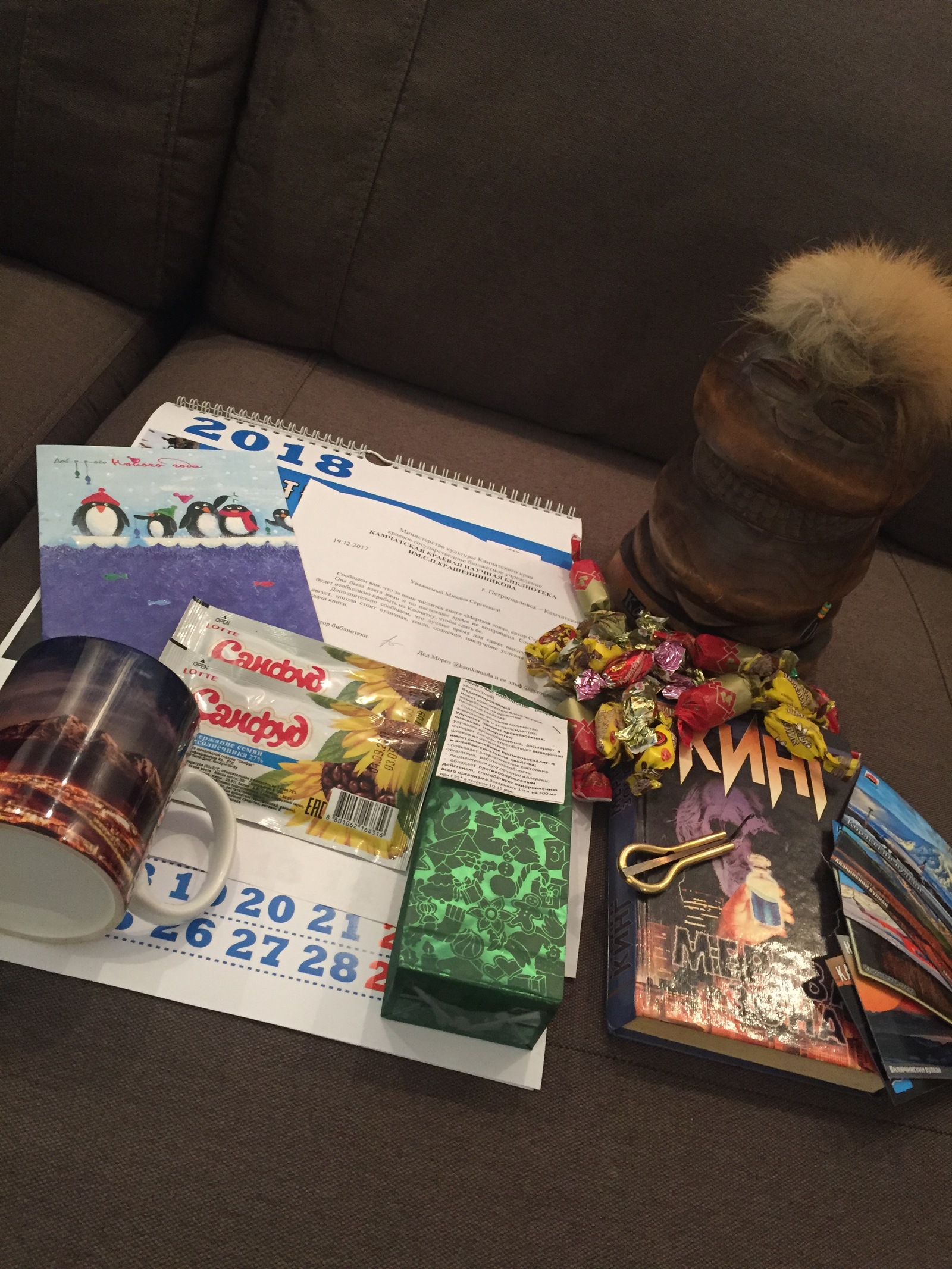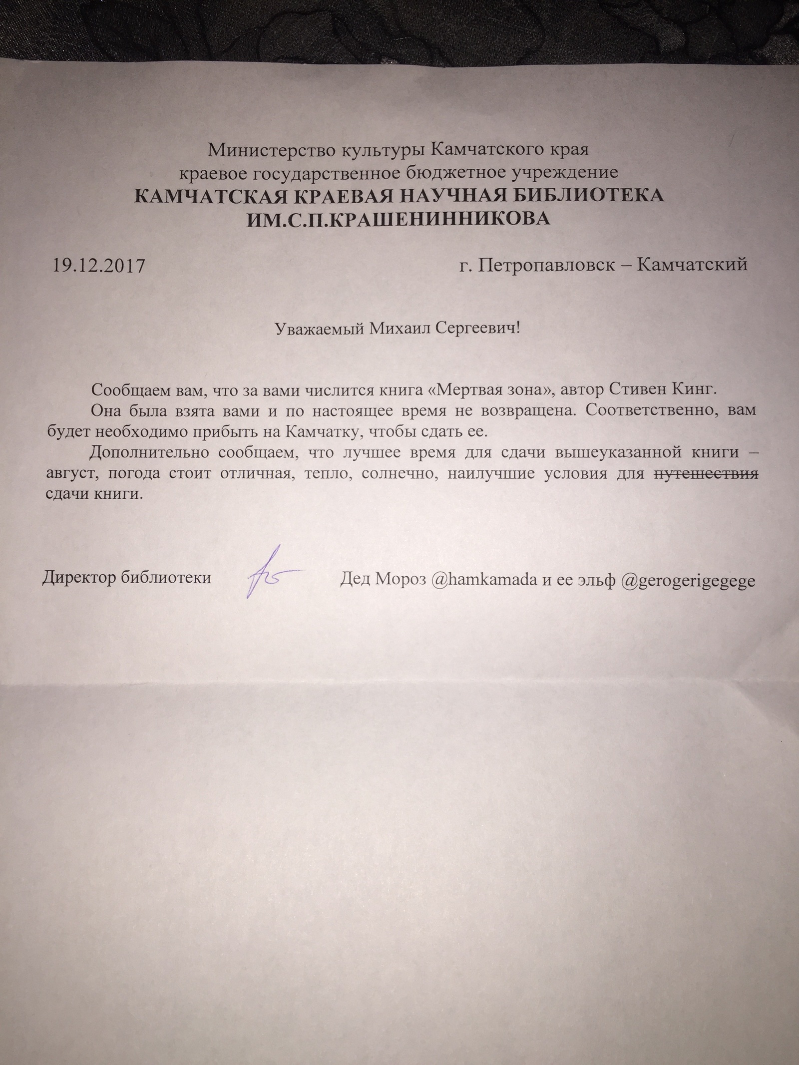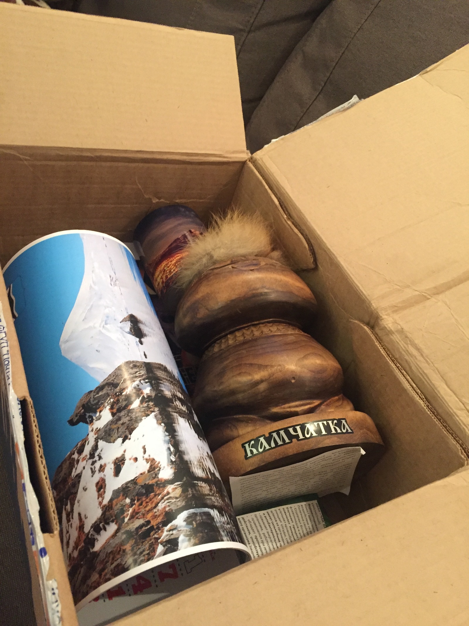 Посылка была буквально набита ништячками из далекой Камчатки. Там были конфеты, кружка, магнитики, пакетик с чаем, самодельный варган и вырезанный из дерева пеликен. Самое интересное– это книга, в которой было письмо из библиотеки, его прикладываю тоже :)