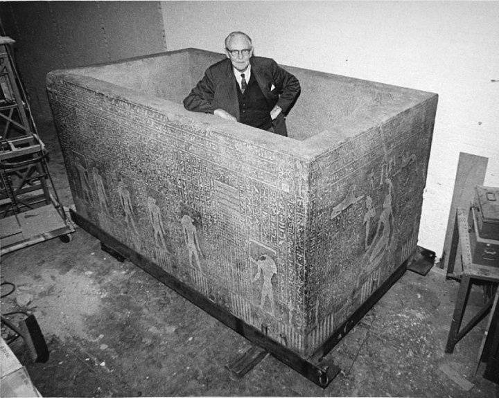 Доус Данхем, американский египтолог в саркофаге царя Аспелты.
