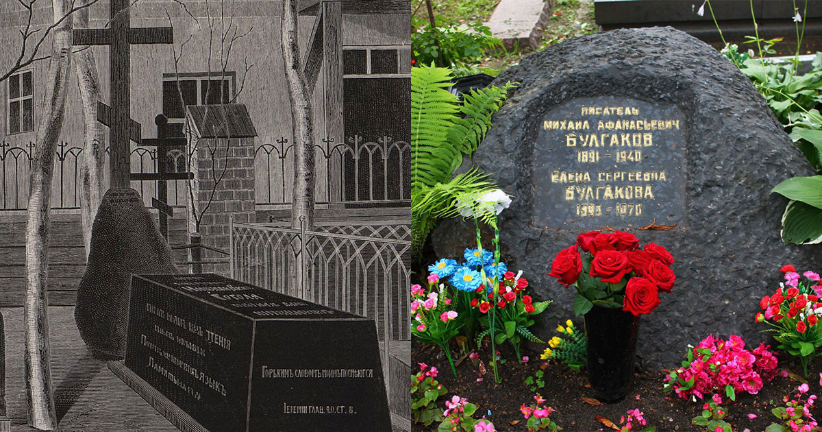 Слева — «Голгофа» на могиле Гоголя, на рисунке Василия Евдокимова-Розанцева; справа — на могиле Булгакова. Изображение: Василий Евдокимов-Розанцев, Tatiana Gothic / Wikipedia