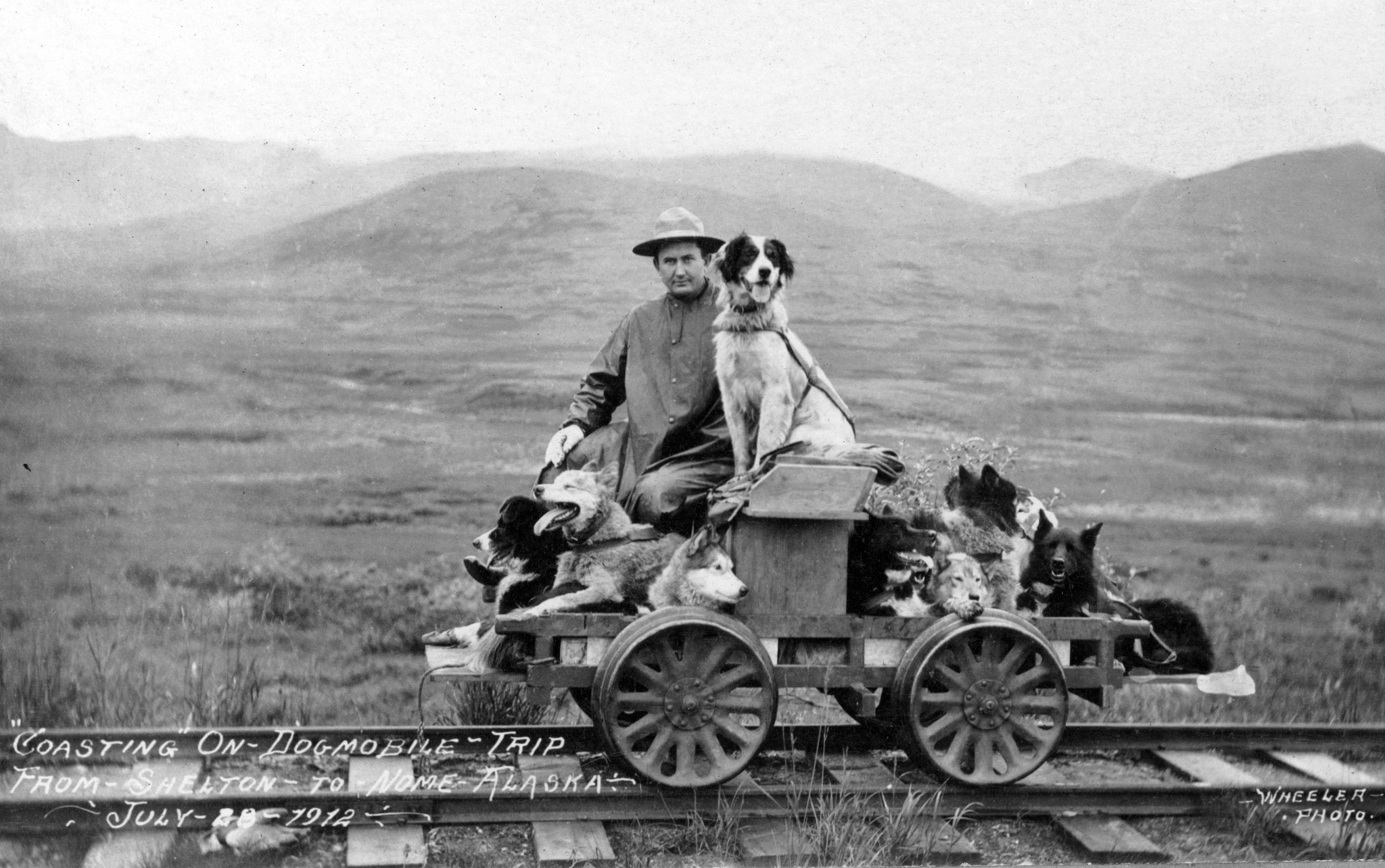 Мужчина и его собачья тележка для путешествий по железной дороге. Аляска, 28 июля 1912 года.
