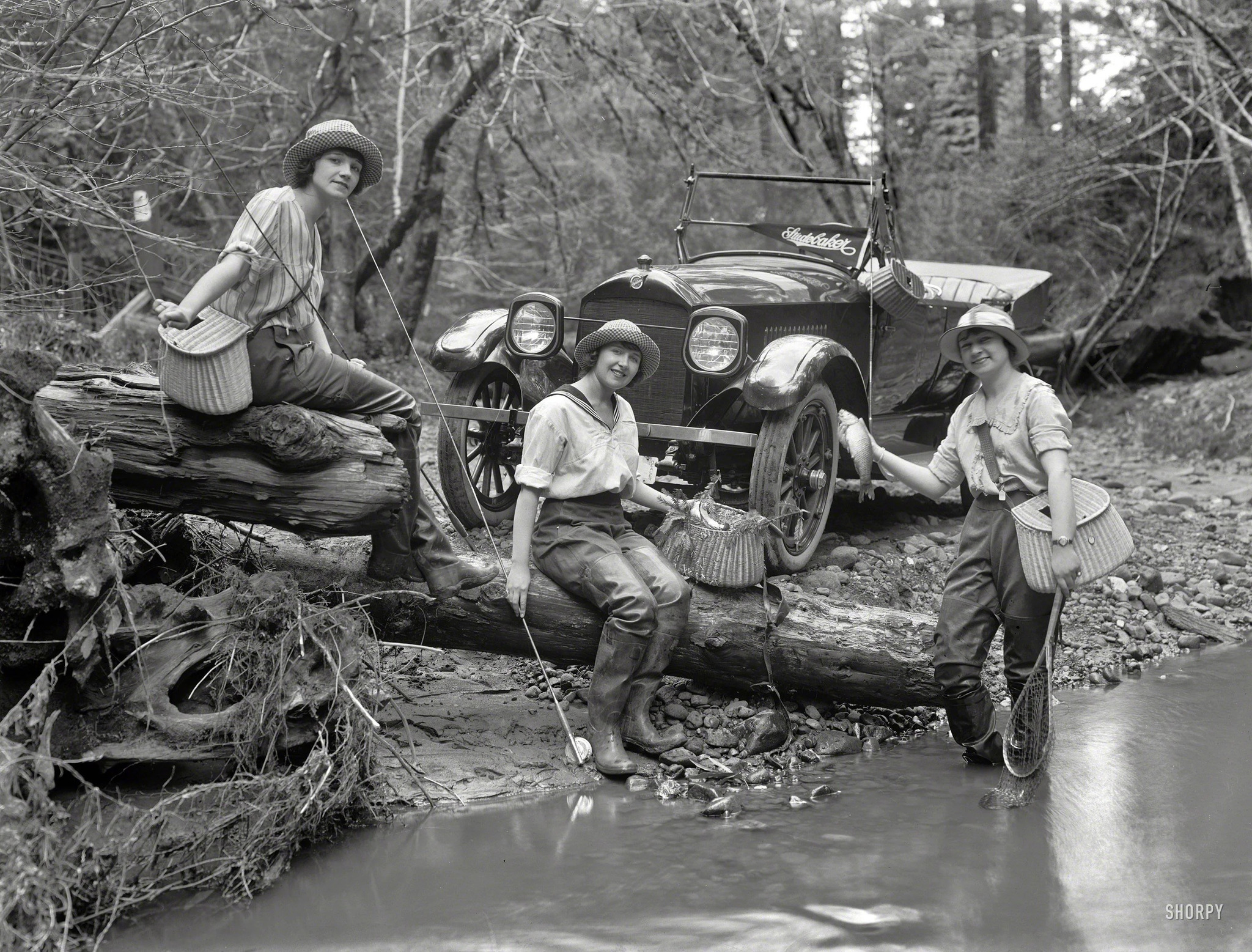 Девушки ловят рыбу рядом с автомобилем Studebaker Big Six. США, 1919 год.