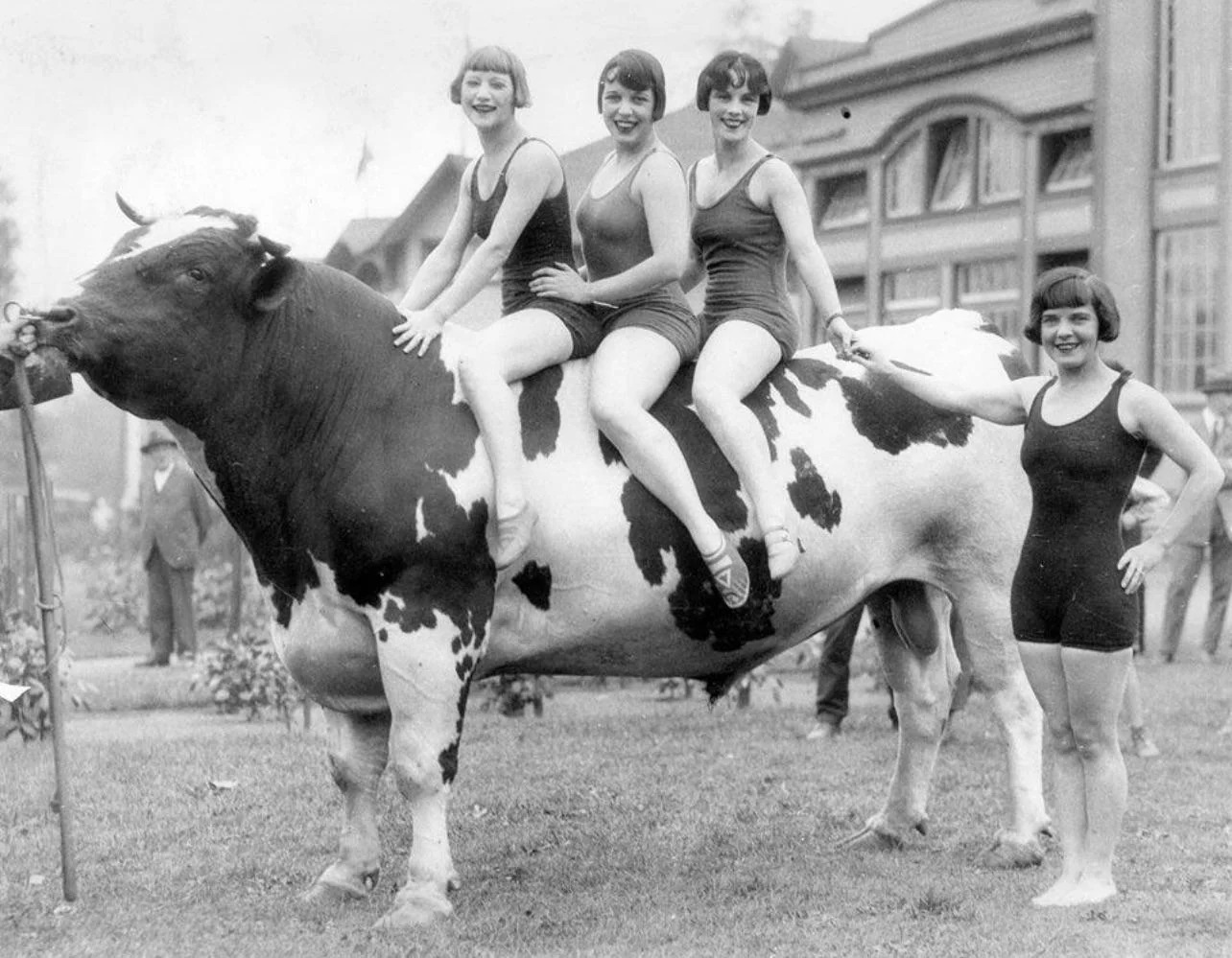 Женщины в купальниках позируют с призовым быком. Ванкувер, 1927 год.
