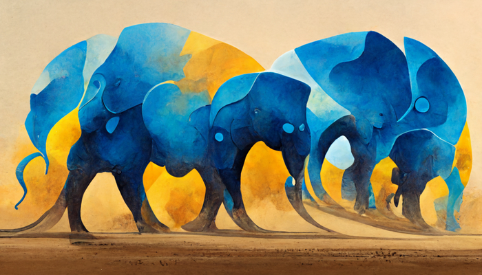 abstract illustration, a set of intensely bright blue elephants walking in a straight line in a golden desert, abstract art