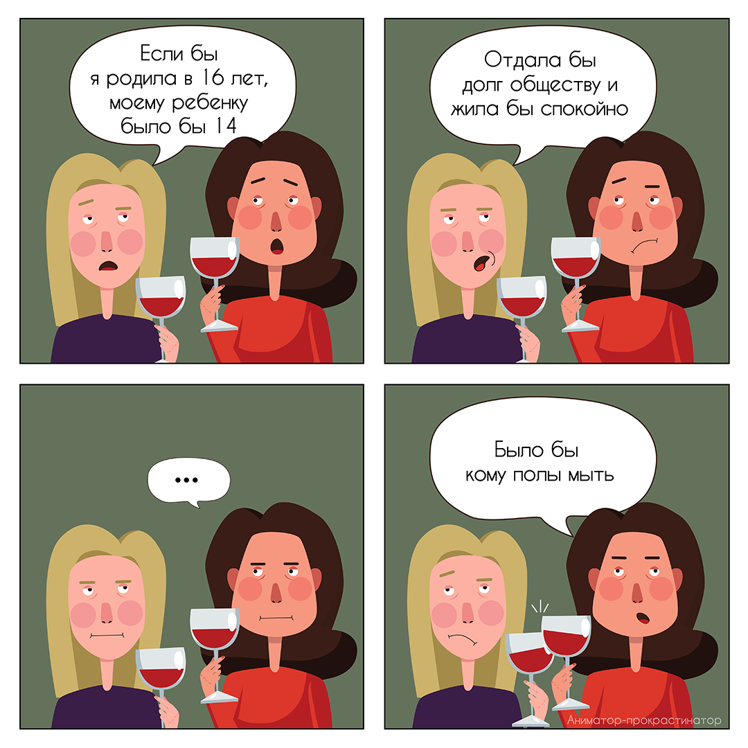 А ещё я заметила, что то, что казалось нам раньше не приемлемым, со временем уже таким не кажется. Например, одна из моих подруг, которая раньше сильно боялась забеременеть рано и «случайно», сейчас жалеет, что с ней такого не случилось. Конечно, ей всего 30 и она сказала это в шутку, но знаете, в каждой шутке есть доля шутки.