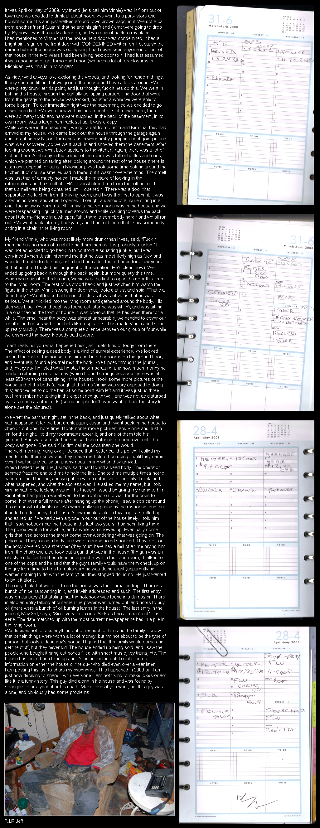 Единственной вещью, которую мы забрали, уходя из дома, был его дневник. Это куча записей, в которой было много всего интересного, включая адреса. Первая запись датировалась 21 января, и там было записано, что этот ежедневник был найден им в мусорке. Там были записи и о том моменте, когда в доме был отключен свет и напоминания купить масло (в доме была найдена куча масляных ламп). Последняя запись была сделана 3 мая и гласила "Заболел — четыре банки. Из-за болезни не могу есть". Это жутко. Дата записи совпадала с датой самой свежей газеты из кипы, находящейся в его гостиной. Мы решили больше ничего не брать из дома в знак уважения ему и его семье. Я знал, что некоторые вещи стоят кучу денег, но мне не хотелось быть человеком, грабившим дом мертвого парня. Я думал, что за вещами придет семья, но этого так и не произошло. В конце концов дом был продан, и я видел, как купившие его люди выносили коробки, забитые нотными листами, игрушечными поездами и прочим. Дом отремонтировали и сдали в аренду. А уже в следующем году информации о том, что кто-то умер в том доме, уже нигде не было. Я пишу это лишь для того, чтобы поделиться с вами. Это произошло в 2009, но я решил рассказать об этом только сейчас. Я не хотел бы чтобы вы подумали что это шутка или очередная смешная история. Этот парень умер в одиночестве в своем доме и был найден незнакомцами спустя год после своей смерти. Шутите, если хотите, но этот парень был ужасно одинок и у него были проблемы. Покойся с миром, Джефф.