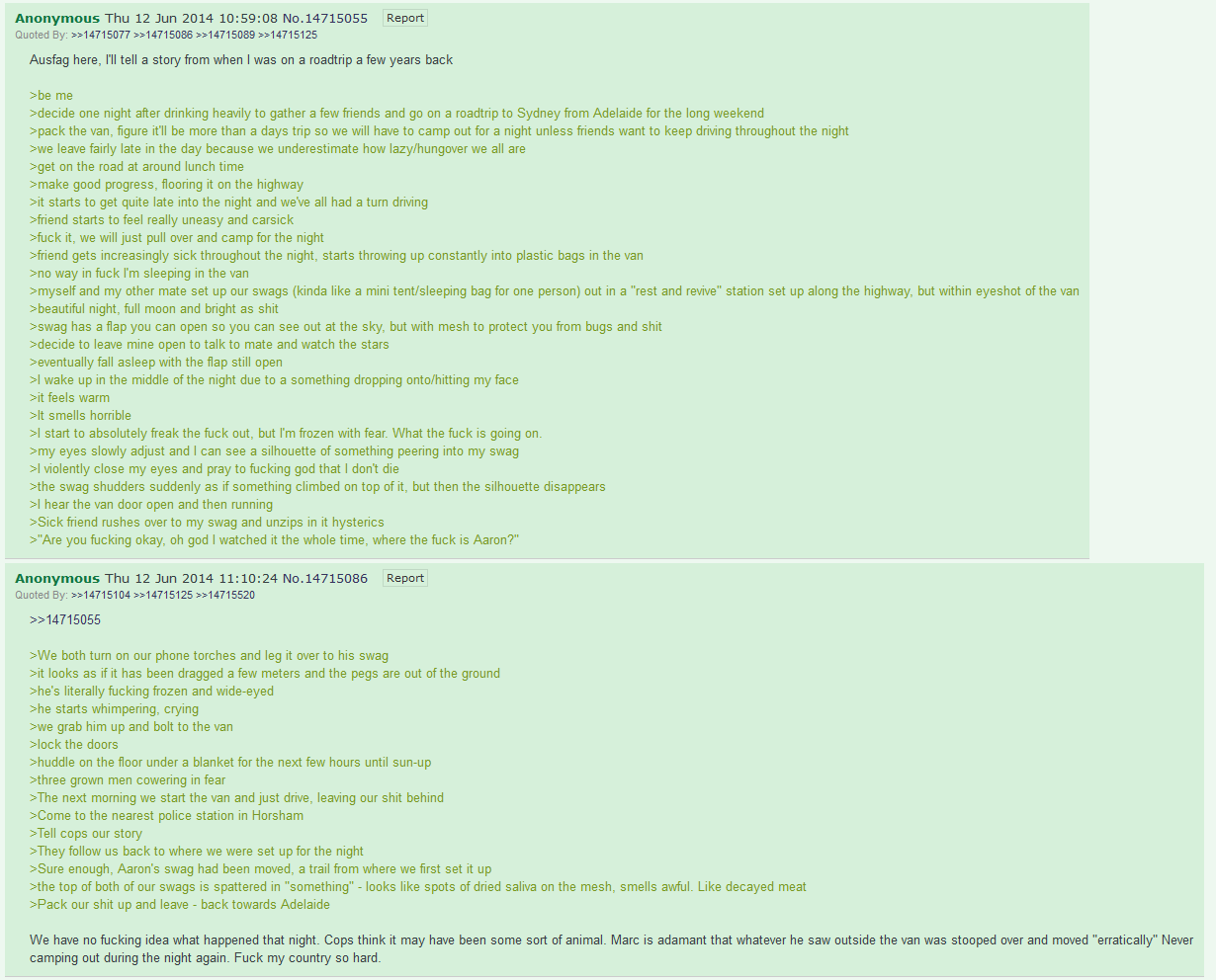 Мы не имеем ёбаного понятия что произошло той ночью. Копы решили, что это могло быть какое-то животное. Марк уверен, что, что бы он тогда ни увидел из фургона, оно было сутулым и двигалось "беспорядочно". Никогда больше устраивали кемпинги после той ночи. Чёрт бы побрал эту страну.