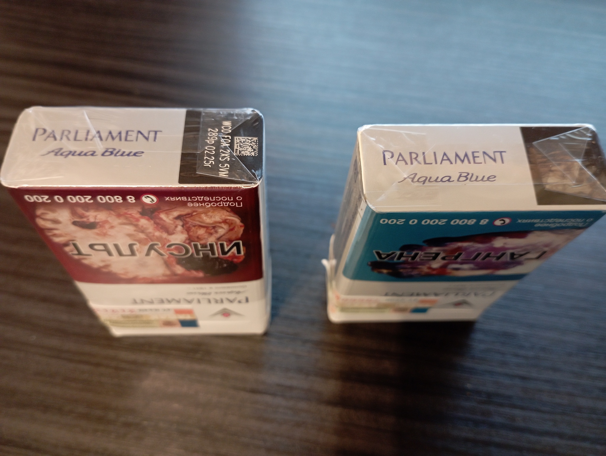 Купил пачку парламента аква блю в табачном магазине возле станции метро Кантемировская. Дома, при открытии, сразу заметил что это подделка, целофан не такой и открывалась плохо. Сравним пачку сигарет, купленную в табачном киоске (справа), с пачкой купленной в винлабе (слева), что мы видим :