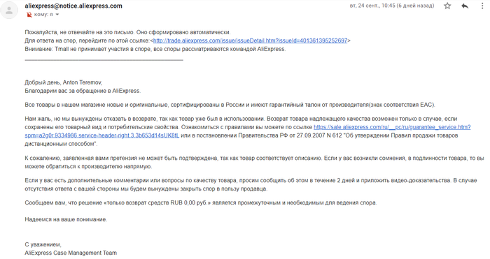 “Нам жаль, но мы вынуждены отказать в возврате, так как товар уже был в использовании.”