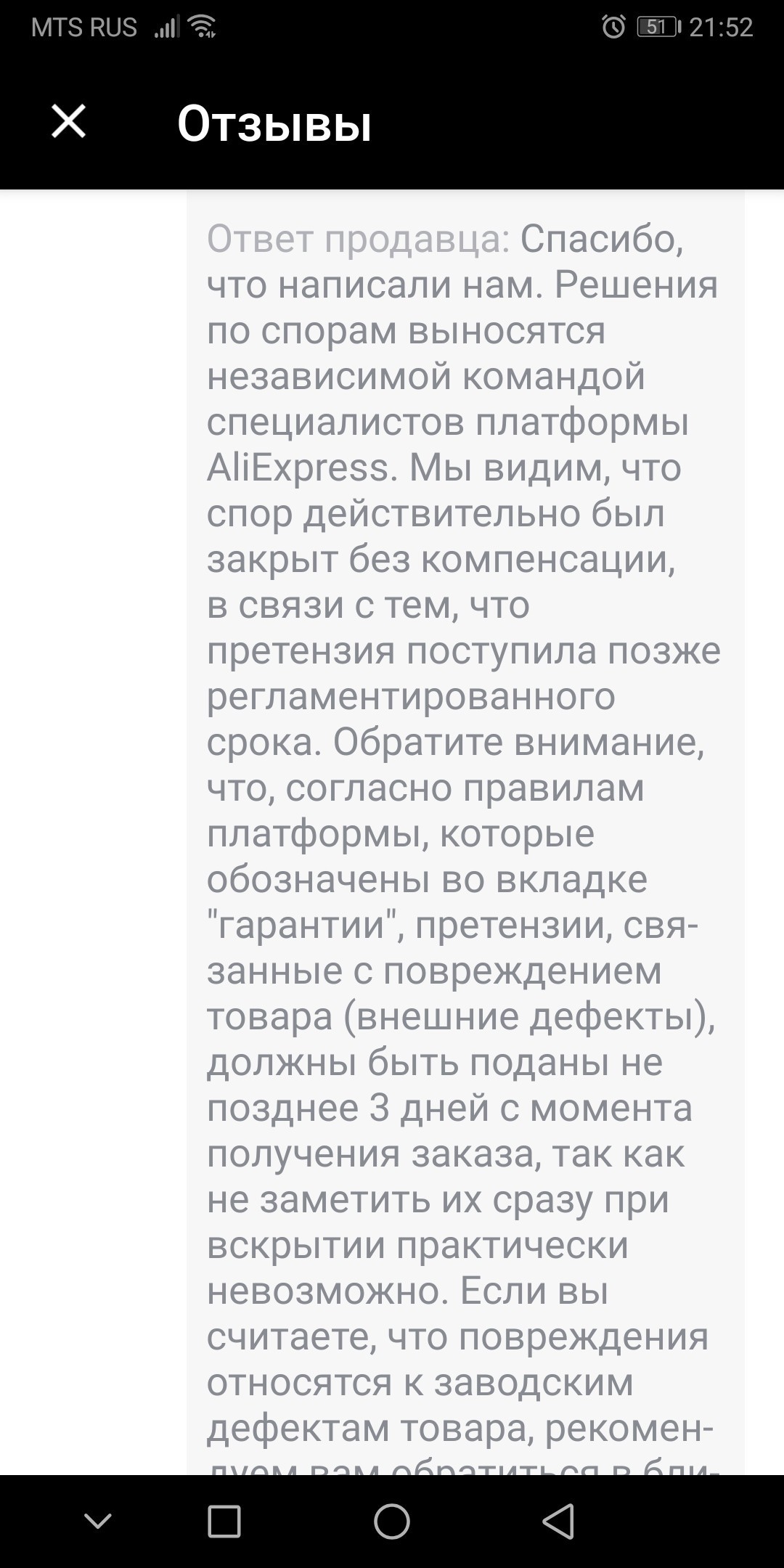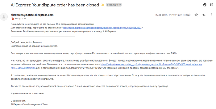 Так как от вас не было получено обратной связи в течение 2 дней, касательно качества полученного товара, спор закрывается в пользу продавца.”