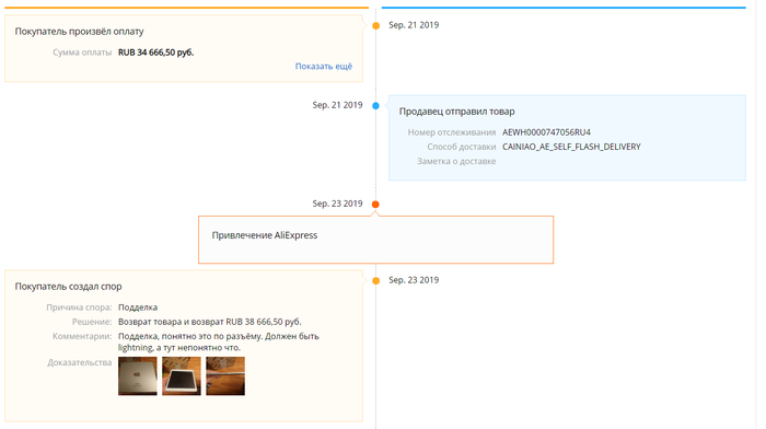 В субботу 21.09.2019 я заказал на сайте tmall.aliexpress.com планшет (Apple ipad mini 256Gb silver) и оплатил его сразу же. Он должен был стать подарком жене. В понедельник 23.09.2019 в 17:00 приехал курьер и привёз коробку, заклеенную скотчем tmall.