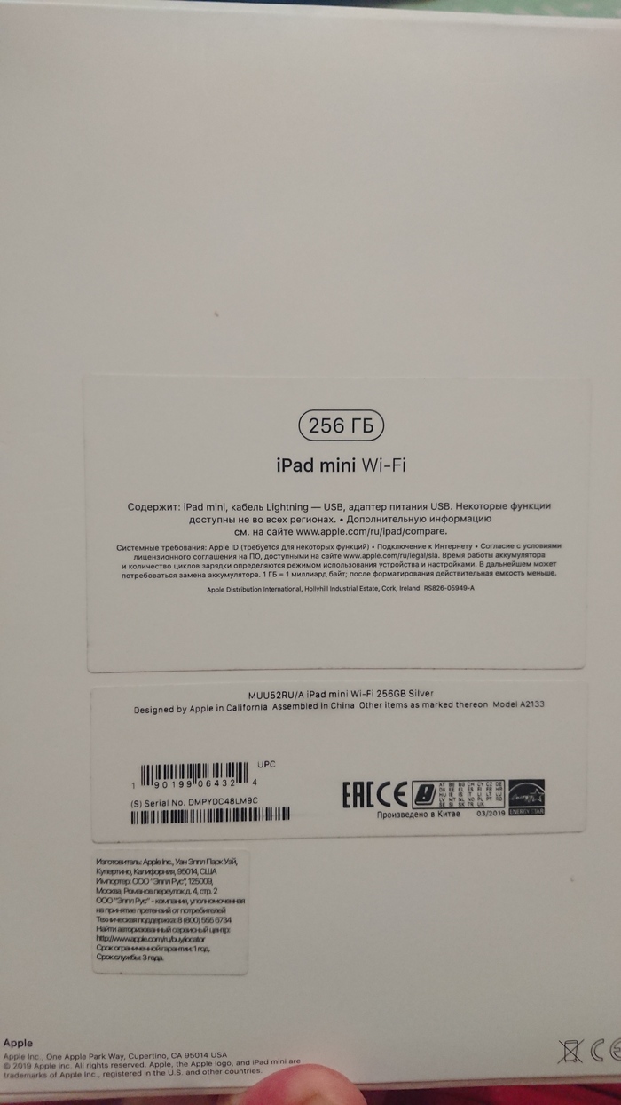 Внутри была фирменная коробка Apple ipad mini 256Gb silver, упакованная в плёнку. Я убрал коробку и уехал на работу.