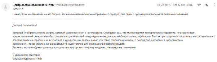 Команда Tmall рассмотрела запрос, который ранее поступил в чат магазина. Сообщаем вам, что мы проверили повторное расследование, по информации предоставленной складом вам был отправлен оригинальный товар Apple имеющий всю необходимую сертификацию. Так как при получении посылки вы не составили акт о повреждениях на коробке и не вскрыли её с курьером, мы делаем вывод что товар отправленный вам со склада был доставлен в целостности и сохранности, предоставленных доказательств недостаточно для совершения возврата средств.