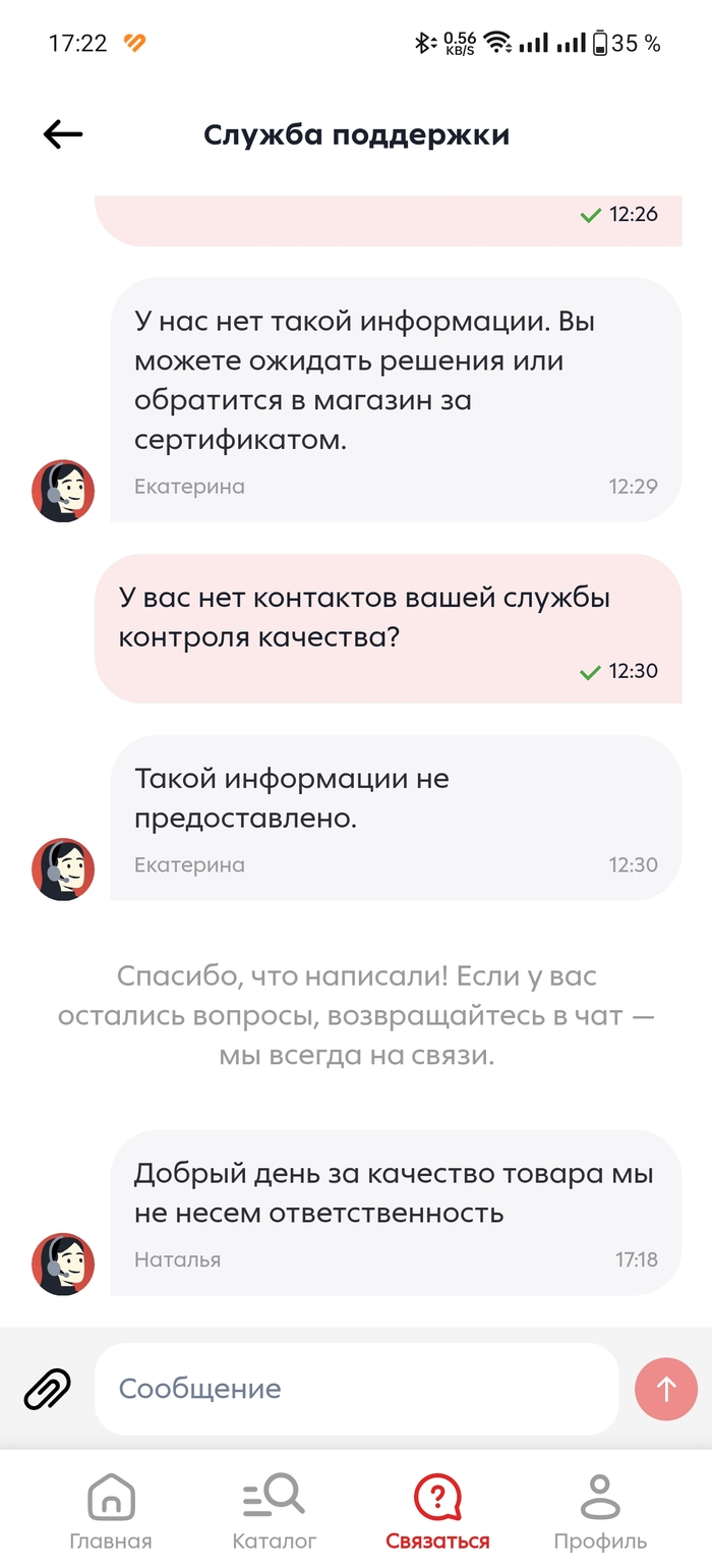 Но самый эпичный ответ пришёл чуть попозже, когда специалист поддержи Наталья сообщила мне, что Пятёрочка не несёт ответственности за качество товаров!