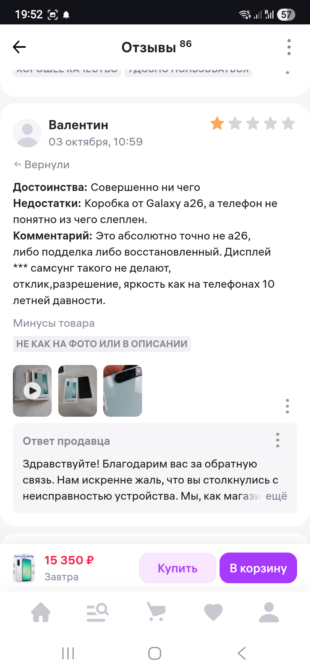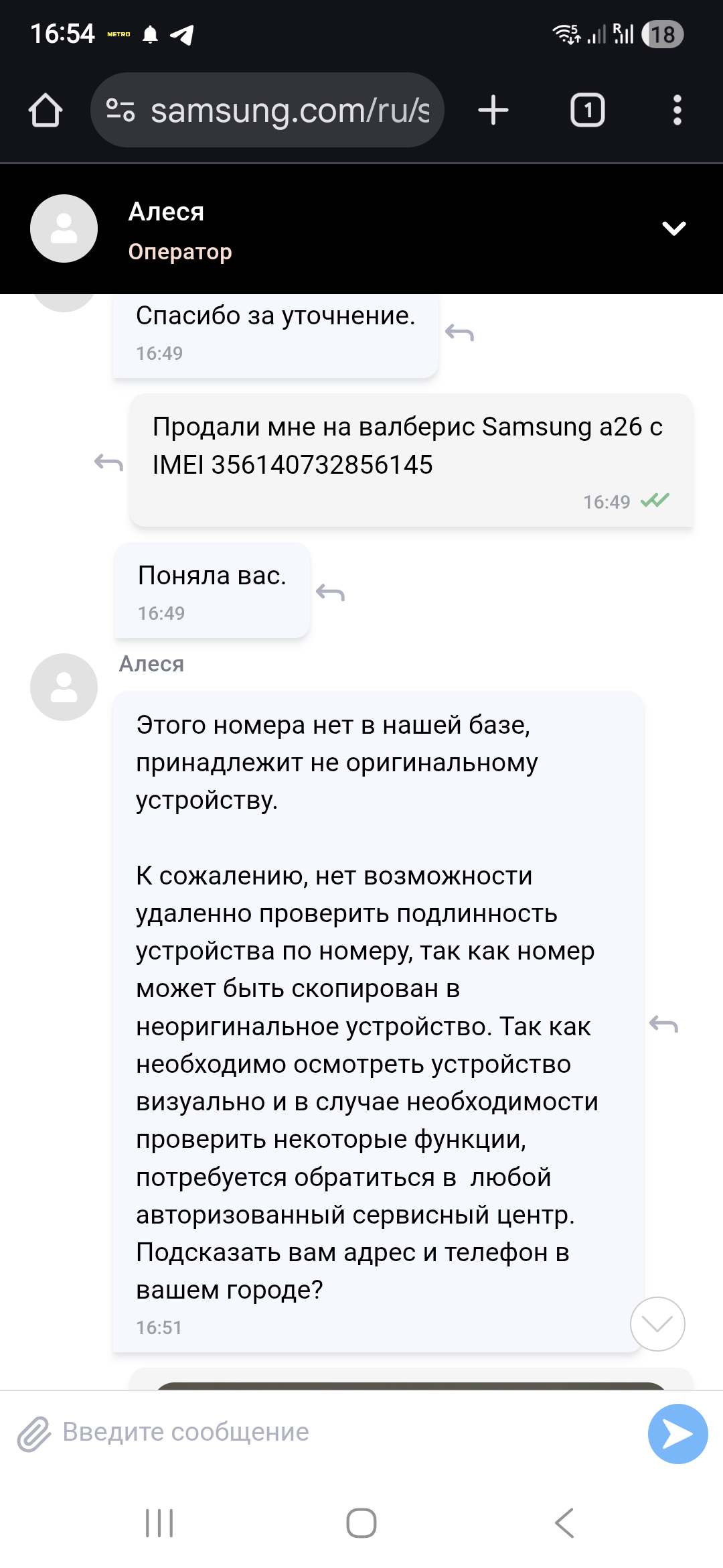 Здравствуйте, сегодня приобрел на wildberries Samsung a26 ссылка на товар - Galaxy A26 8 256 ГБ, Samsung https://www.wildberries.ru/catalog/555509669/detail.aspx Придя домой обнаружил что от Samsung a26 там только корпус, внутри начинка от Samsung a16, не думал что такое в природе существует, но оказалось реальностью, имей телефона пробил а он не настоящий, прикрепляю два скриншота один из настроек телефона и второй из программы проверки аида64 где видно что на самом деле представляет данный смартфон. Хотелось бы конечно вернуть данного Франкенштейна и получить свои деньги назад, надеюсь валберис увидит и проведет проверку, а продавца бы забанить за такое мошенничество. Это уже не какой то китайский смартфон без названия в корпусе Samsung s25 ultra, это более серьезные подделки, будьте внимательны, теперь в корпусе того же s25 может быть старый s21, подделки вышли на новый уровень!