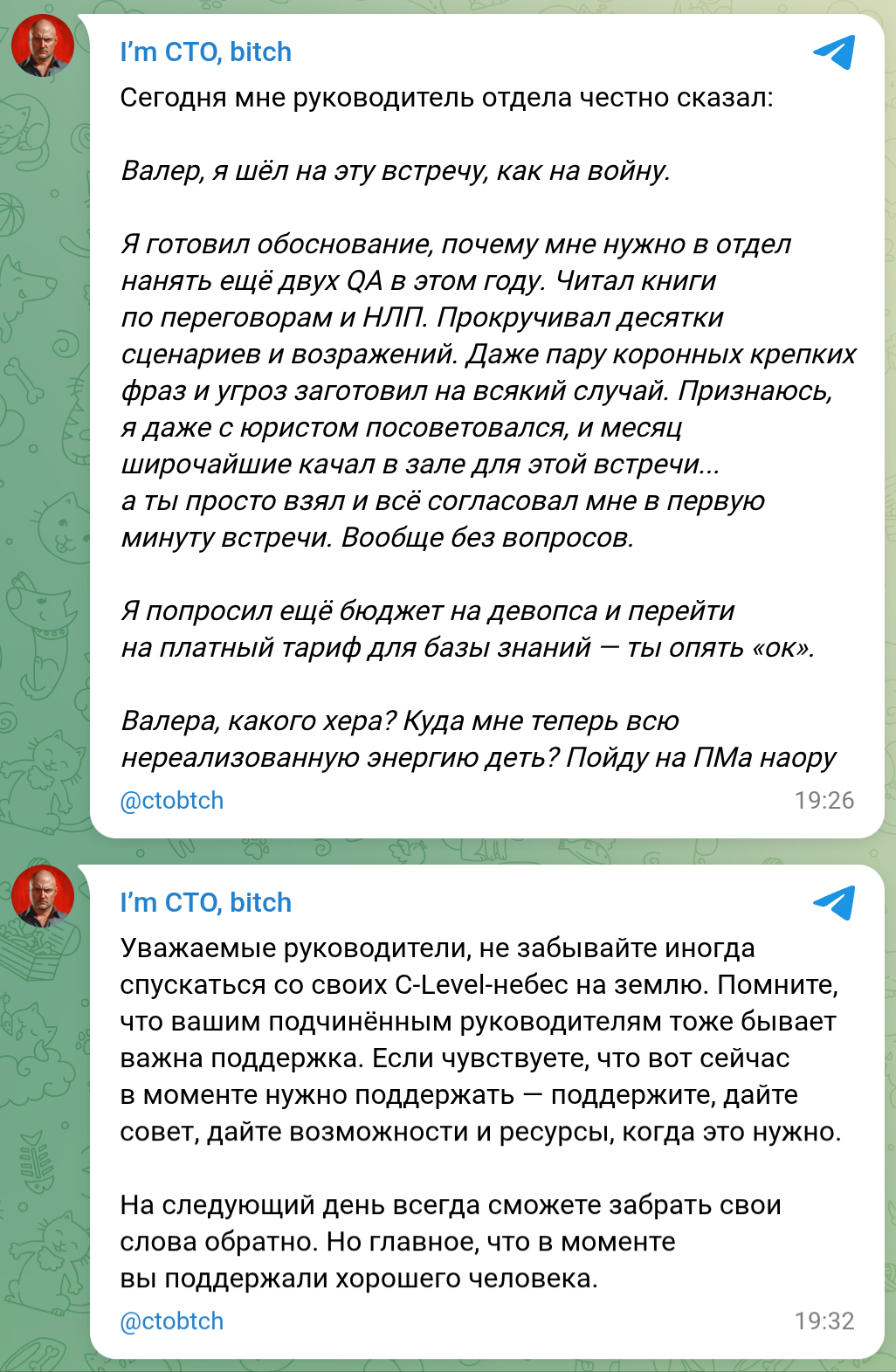 382 imctobitch Норм автор Юмор для всех и каждого Серия I'm CTO, bitch Поддержка от руководителя 3 месяца назад 😆 Телеграм-канал [моё] I`m CTO bitch Скриншот Юмор Руководство Тимлид Найм Бюджет Эффективный менеджер Неожиданно Валера Переобувание Моральная поддержка Мат 46 7 1 Ещё 0