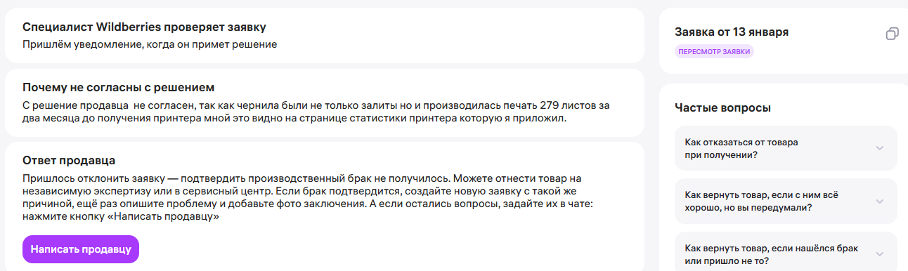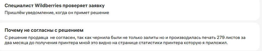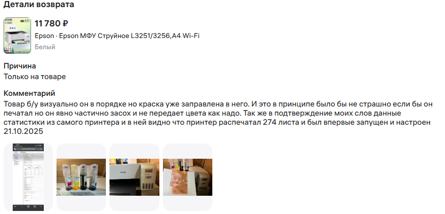 И тут мы видем что принтер Б/У и был запущен впервые 21.10.25 (напоминаю я принтер получил 13.01.26) и распечатал 279 листов, естественно я пишу на WB и требую возврат товара