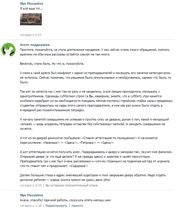 1483 azzurik 9 лет назад Поддержка ВКонтакте когда то весело жила Убрал номер Агента т.к. боюсь за его здоровье. [моё] ВКонтакте Поддержка История Учеба