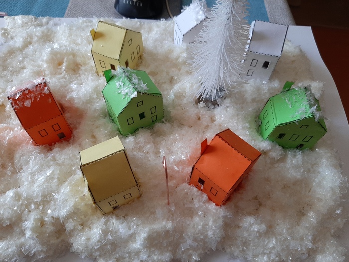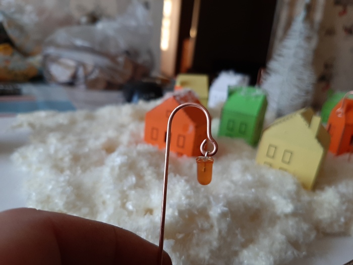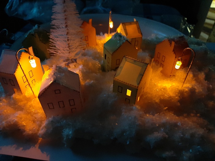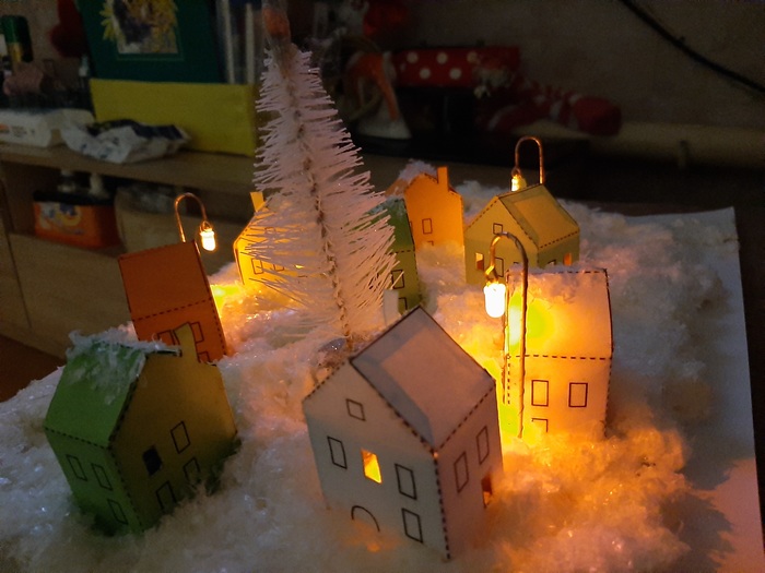 Так же лампочки вставил в домики. Вот такой вид получился. Да не идеально. Но детям очень нравится.