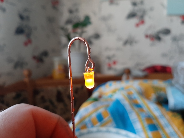 Далее делаем фонарики, светодиод как сам фонарь, долго думал над формой и решил из проволоки она же будет "+" светодиода. Минус же обмоточной проволокой обвит вокруг и пропущен вниз основания.