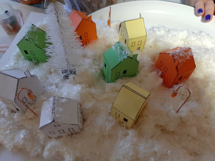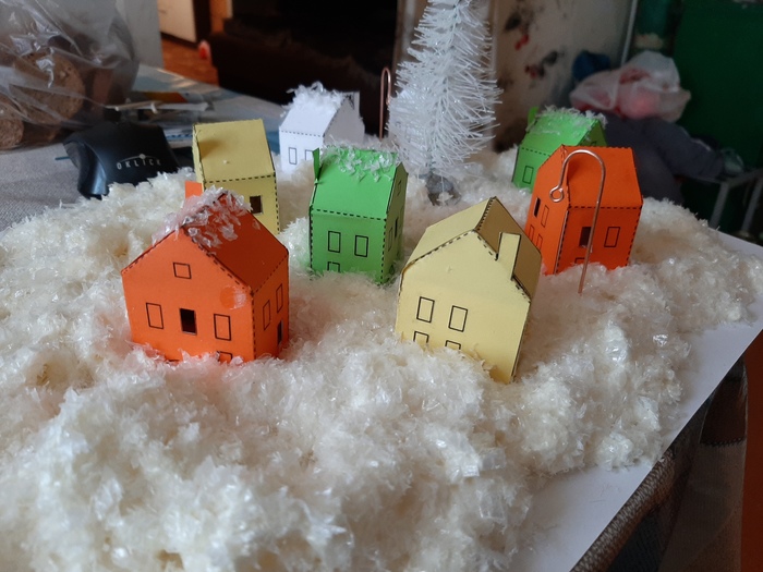 Распечатали домики, вырезали, оклеили внутри картоном, чтобы не просвеивалось, склеили.