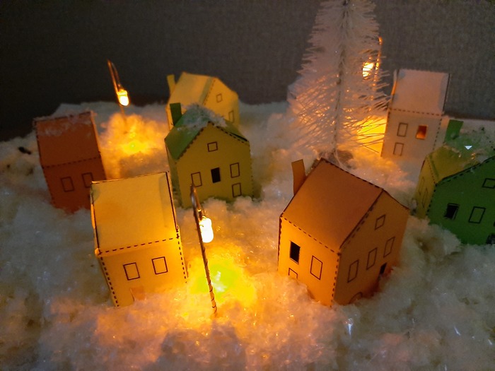 В планах было подсветить все домики и ёлочку, но в процессе было решено упростить, чтобы не устраивать переизбыток света.