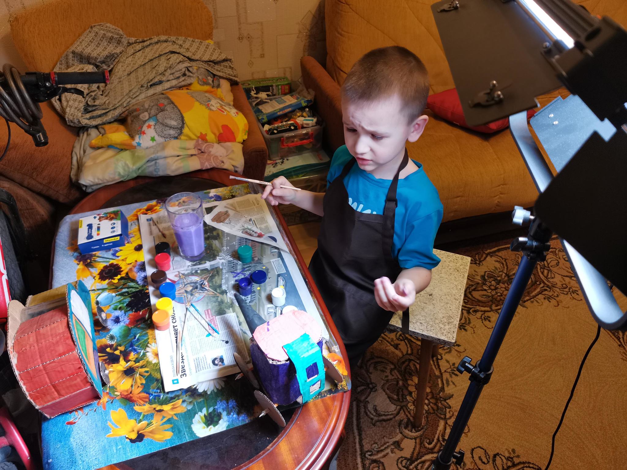 Отличное развлечение. Саша обдумывает идею, рисует чертеж-набросок. Я помогаю с раскроем, он сам режет все строительным ножиком и клеит термопистолетом. С механикой и конструкцией помогаю немного.