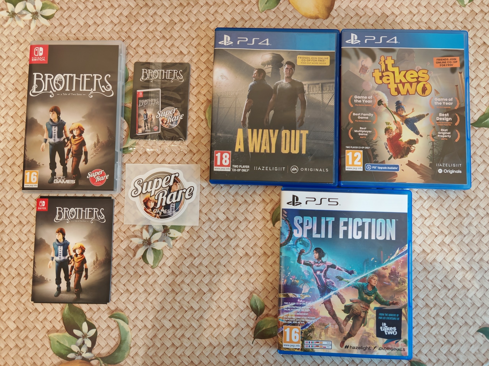 Сегодня второй раз прошёл It Takes Two, первый раз проходили с женой, второй раз с сыном. Играл за разных персонажей с промежутком между прохождениями около двух лет. Просто по кайфу! Brothers a tale of two sons планирую третий раз проходить, с сыном. Первый раз соло играл и изначальная фишка этой игры управление двумя персонажами сразу. Второй с женой, теперь очередь сына 😊 Кто не знает это игры приключения от геймдизайнера Джосефа Фареса. Офигенная реализация кооперативного прохождения за одним компом (ну можно и по сети). Личное мнение это шедевры видеоигрового искусства. Хочется все игры в красивом исполнении - коллекционки, стилбуки, все с мануалами, но имеем что имеем. Ещё хотел бы их все на свич, но свич не вывозит такие грузные игры, поэтому всё, кроме братьев взял на плойку. Братьев бы тоже взял на плойку, но когда покупал в коллекцию не было плойки. A way out спорная конечно по механикам, но тоже очень крутая игра. Жаль с сыном пока рановато в неё играть, она хоть и 18+, но думаю не будем ждать совершеннолетия мальца, через пару лет доберёмся и до неё. Split fiction единственная игра, до которой не дошли руки, но думаю до нового года осилим и её.