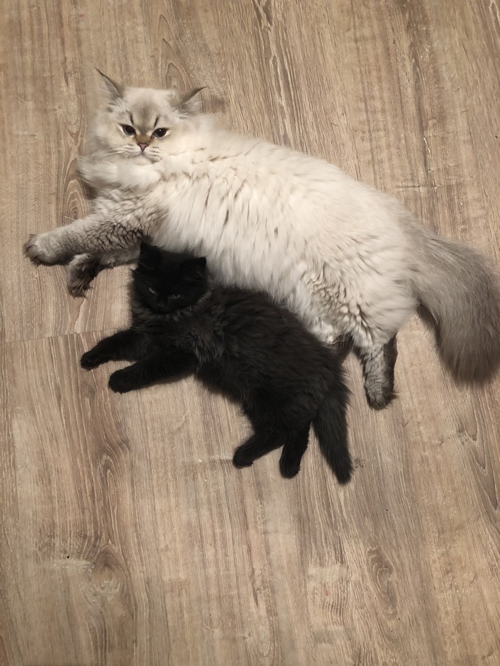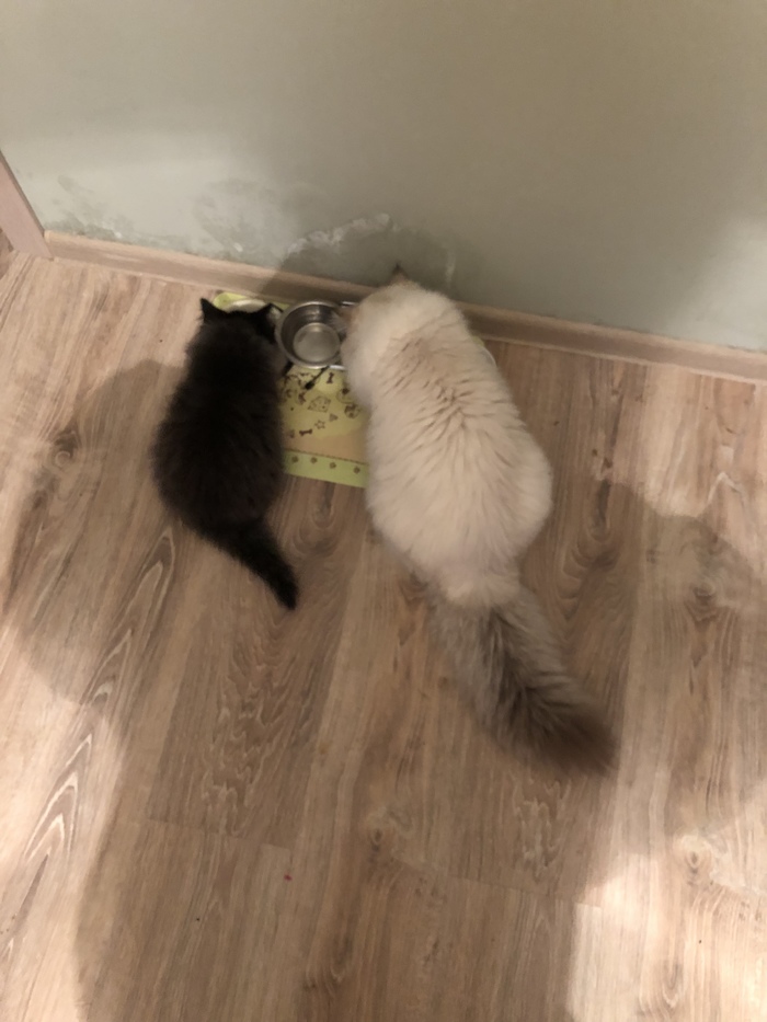 Первые три дня были очень фееричными. Драко раздувался грозным шариком и пытался кошмарить мелкого. Шипел, плевался, но бить не бил и смотрел на нас с вопросом «на какой помойке вы ЭТО нашли? Отнесите где взяли». Подружила их пирамидка для котиков и разные принципы игры. Дети, что уж.