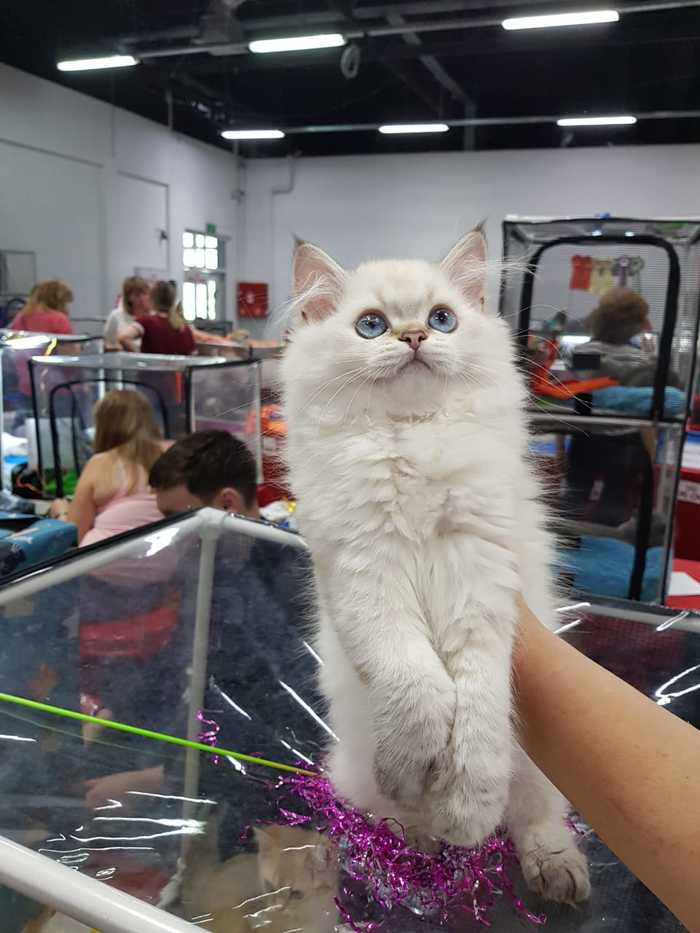 В прошлом году меня накрыло тем, что мне не хватает кошачьего счастья. Прожив всю жизнь в доме где были кошки, я не выдержала и четырех лет без мяукающих друзей. Прошедшим летом, не вынесла душа поэта и получив годовую премию, я заявила любимому человеку «хватит это терпеть!». Вернувшись с очередного рейса, и толком не спав мы понеслись на проходившую тогда котовыставку искать кошачьего счастья. Я кружила вокруг стоек с мейнкунами и искала счастья. А потом любимый человечек отвел меня к стойке британских кошек, где среди выводка классических плюшек сидел Он.