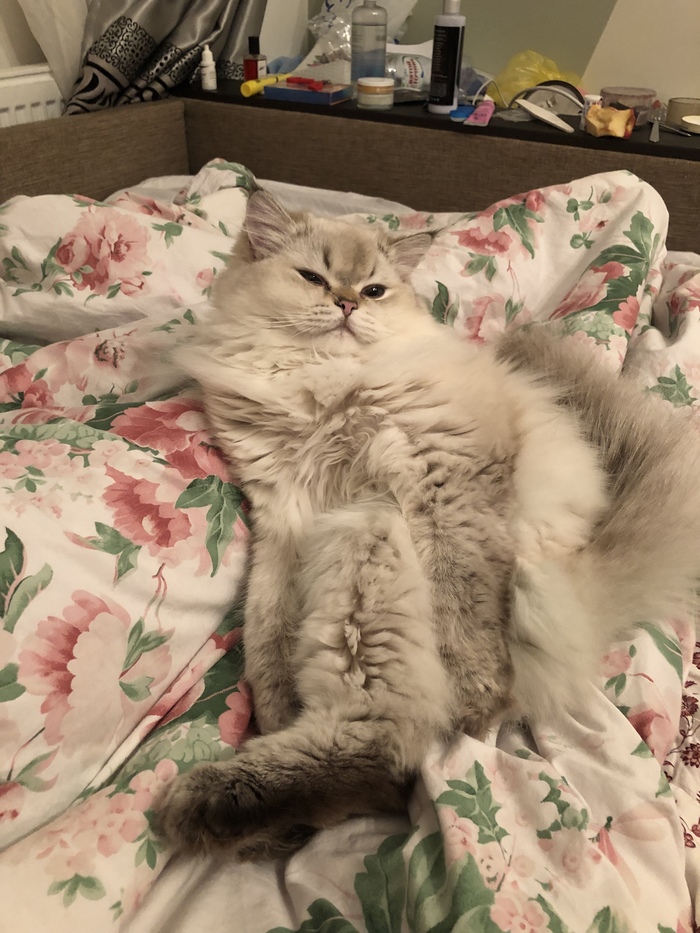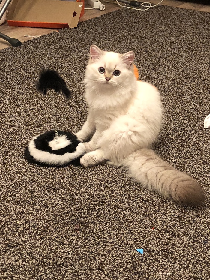 Ему уже год. Он степенный, важный и как ни странно очень нежный и ручной котик, а еще фантастически пушистый. Дракотик до безобразия ленив, немного тугодум и местами трусишка. Он не любит вычесываться, но спокойно кушает таблетки и дает подстричь коготки. На третий день он нас испугал. В какой-то момент начал бегать по квартире и отчаянно плакать. Мы испугались, что у него что-то болит, но все оказалось проще. Он испугался стиральной машины, а ему очень хотелось в туалет. Он терпел пока она не выключилась, а потом бежал высекая искры на ламинате. И смешно и страшно. Зато, у него бульдожья хватка и если он поймает пучок перьев на любимой удочке, то забрать его будет нереально.