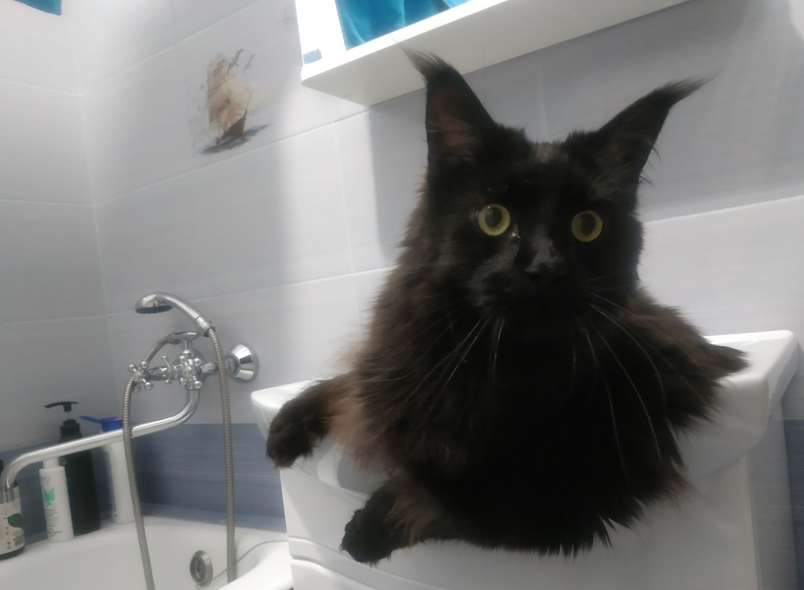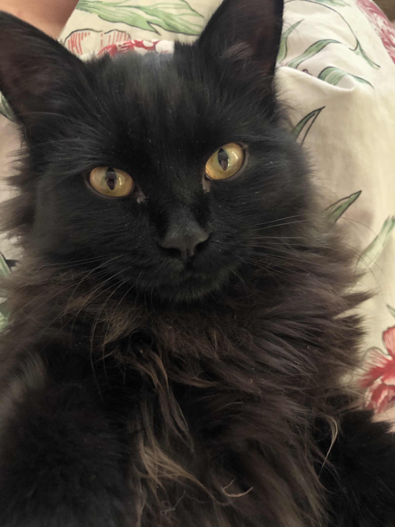 Ему уже год. Он степенный, важный и как ни странно очень нежный и ручной котик, а еще фантастически пушистый. Дракотик до безобразия ленив, немного тугодум и местами трусишка. Он не любит вычесываться, но спокойно кушает таблетки и дает подстричь коготки. На третий день он нас испугал. В какой-то момент начал бегать по квартире и отчаянно плакать. Мы испугались, что у него что-то болит, но все оказалось проще. Он испугался стиральной машины, а ему очень хотелось в туалет. Он терпел пока она не выключилась, а потом бежал высекая искры на ламинате. И смешно и страшно. Зато, у него бульдожья хватка и если он поймает пучок перьев на любимой удочке, то забрать его будет нереально.