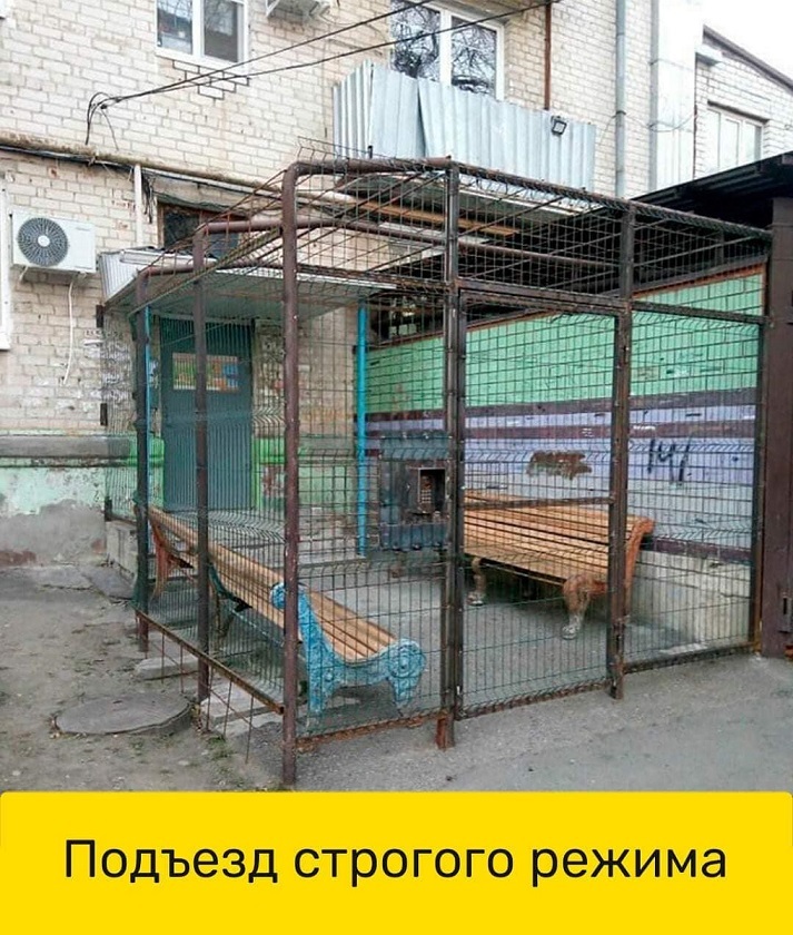 Жильцы огородили вход в подъезд металлическим забором, который напоминает клетку из мест отбывания наказания.