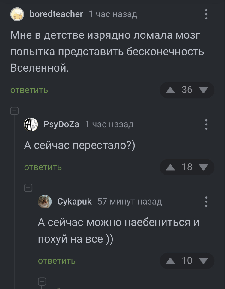 2554 WWW.LENINGRAD Подход взрослого человека1 9 месяцев назад #comment_341412426 Картинка с текстом Вселенная Бесконечность Комментарии на Пикабу Скриншот Мат 57 9 9 1 Ещё 0
