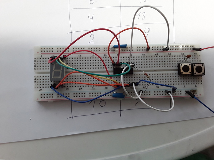 Можнр добавить еще один индикатор и микросхему. Для этого берем второй счетчик 4026 ставим его в плату, подключаем его так как и первую микросхему (конечно же с семисегментным индикатором). Только подключаем без резистора от первой ножки и кнопки переключения счетчика. Тянем провод от второй микросхемы к пятому выводу второй микросхемы. Объеденяем пятнадцатые выводы всех микртсхем и подключаем к кнопке сброса.