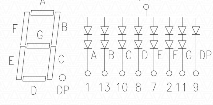 Берем одноразрядный семисегментный индикатор. Подключаем его по схеме: