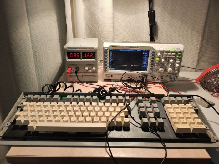 На фотографии видно, что я уже перехватываю нажатия клавиш, с помощью осциллографа. Клавиатура потребляет достаточно большой ток 0,3 А, при 12 В — это уже 3,6 Вт! Что, как по мне, для обычной клавиатуры многовато.