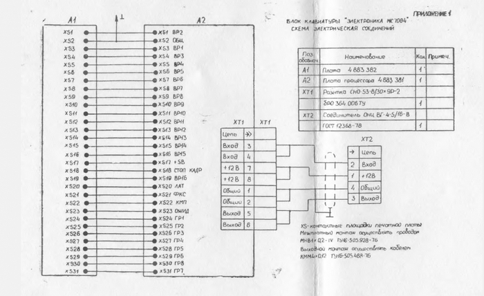 Для того чтобы просто включить клавиатуру (подать питание), пришлось рыть кучу документации. Нашёл неплохой сайт по ДВК, где приведены два типа паспорта (см. раздел «Клавиатура МС 7004»). В паспорте самое ценное — это схема и коды клавиш. Как ни странно, далее английская документация оказалась более полной. Итак, схема подключения.