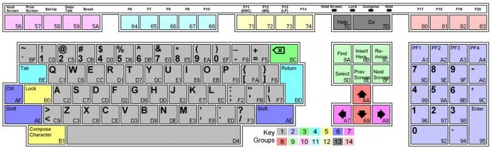 Помните, я говорил, что клавиатура имеет фонетическую раскладку? Самое удивительное, что слизали всё подчистую, и коды клавиш точно соответствуют кодам клавиш по физическому расположению у оригинальной клавиатуры LK201.
