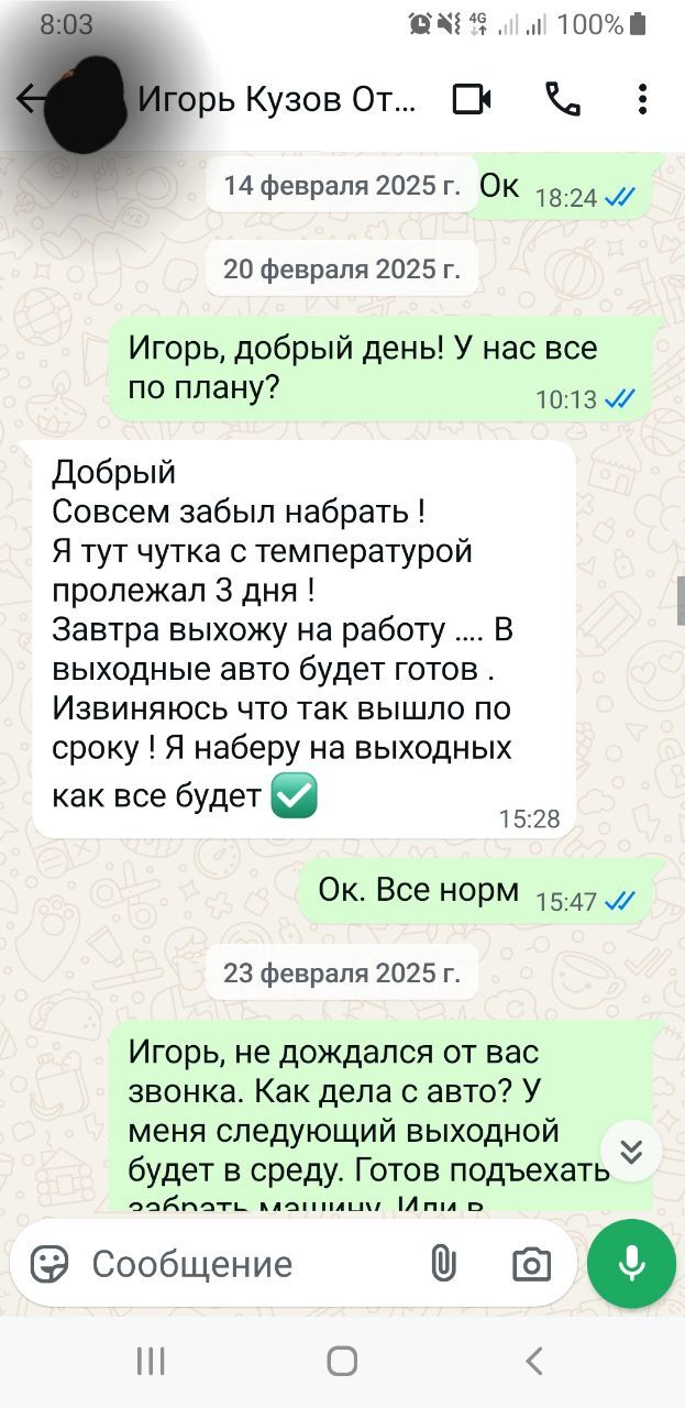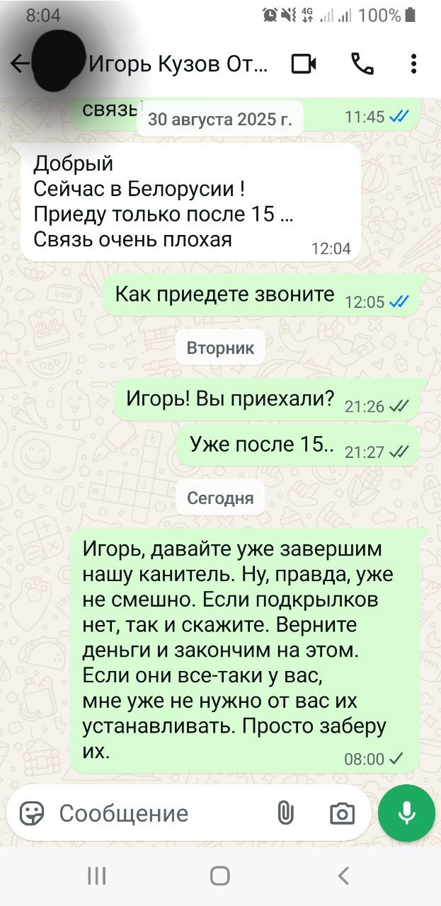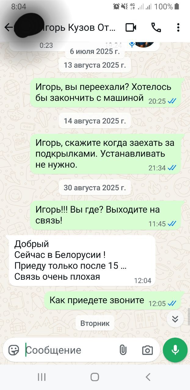 Сначала Игореха проебал сроки ремонта, потом "заказал не те подкрылки". Сперва я не забирал машину после ремонта, ждал подкрылки (неделю или две). Потом забрал авто и договорились, что я подъеду как только доставят подкрылки. Потом я просил его дать мне контакты доставки, чтоб самому с них вытрясти "заказанное и оплаченное".
